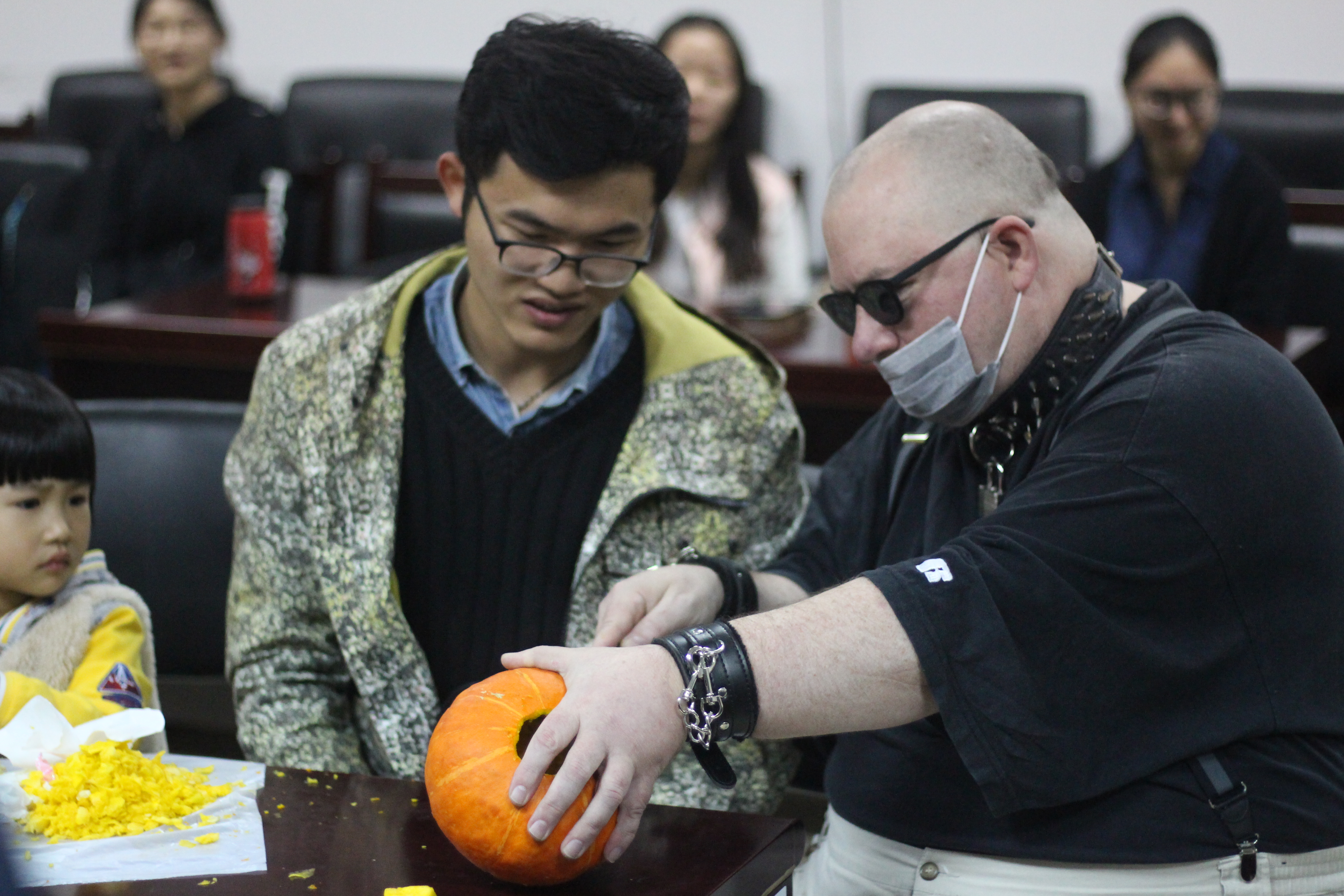 当晚,师生们带着面具、涂着油彩,用英语快乐地交流着。外教Jeffrey Smith正在教同学们制作南瓜灯。他首先讲解了南瓜灯的制作:先把南瓜顶部切开,再将内部掏空,然后在南瓜外层刻出鬼脸的表情,三角形的眼睛和鼻子,咧开的嘴,十分搞怪。最后在南瓜内部放上蜡烛,盖上南瓜帽,就完成啦。虽然说的容易,但南瓜灯的制作却着实是个力气活。同学们根据Jeffery的描述,并发挥自己的创造力,完成了一个个可爱搞怪的南瓜灯。“我们做好了!”一组同学兴奋的叫喊着。Jeffrey赶紧小跑到那边,双手捧起南瓜灯,兴奋大赞“Perfect!”。随后其他几组也相继完成,尽管有的南瓜灯歪了嘴,有的眼睛大小不一,但同学们都为自己的作品而感到自豪。周绍东老师也在现场指导和督促同学们制作,和同学们玩成一片。