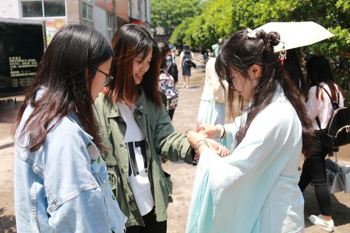 活动现场,伴随着清越悠扬的古琴声,身着鹅黄色上衣和淡蓝色襦裙的学生为路过的师生们佩上香袋,系上彩绳。彩绳由青、白、红、黑、黄色五色组成,据说可以驱邪除魔,祛病强身,健康长寿。同学们还为每一位参加体验活动的师生现场讲解了端午节的来源与习俗,让同学们深入了解端午节的来龙去脉,感受悬艾草、挂菖蒲、吃粽子、饮雄黄酒等习俗中包含的传统文化。师生们还纷纷在现场提笔写下心中寄语,表达了对祖国、学校、家人的美好祝愿。