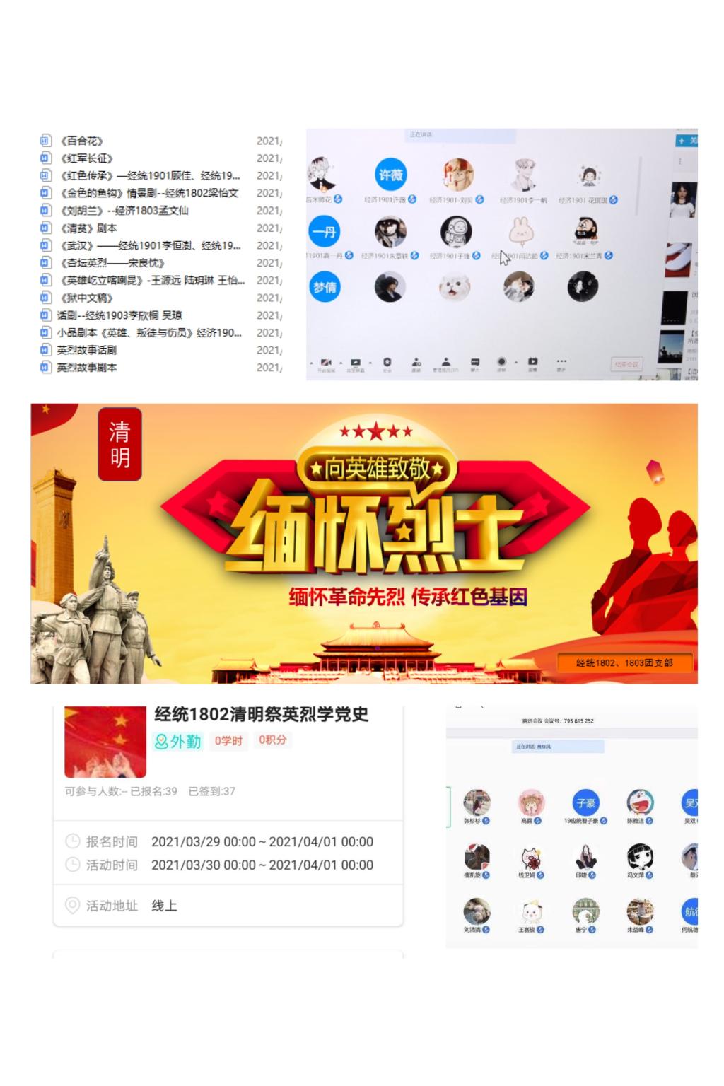 各团支部相继开展以“缅怀革命先烈、传承红色基因”“经典随行、做时代好青年”“清明追思 缅怀先烈”“红色基因代代传——清明祭英烈 共铸中华魂”为主题的团日活动。经统1802、1803团支部联合开展了网上祭英烈活动,通过网上献花、留言等方式祭奠先烈,表达敬意。经济2001团支部通过“挑战杯”红色专项活动的经验交流,分享了革命事迹和英雄故事,并在“时代青年承诺书”上署名以完成承诺,汲取奋发精神,传承红色基因。经济1901团支部、研究生团支部通过腾讯会议线上学习“四史”,分享革命事迹,缅怀抗日保家卫国的烈士们,交流心得体会,感悟祖国发展和日益强大的精神动力源泉。经济1902、经济1903团支部集中重温入团誓词,聆听革命故事,宣传英烈的感人事迹,将红色基因融入青年血夜。经统1903、经济2003团支部讲述革命英烈的先进事迹,缅怀先烈,发扬革命先辈的优良传统。经统2001团支部以集中观影的方式,重温老一辈革命家在风雨飘摇的年代里为国家赴汤蹈火的革命情怀,接受了深刻的革命传统教育和爱国主义教育。william威廉中文分团委和学生会联合开展“传承红色基因、清明云祭英烈”线上主题学习会,以“云”祭奠的方式,缅怀为民族独立,为人民解放抛头颅、洒热血的革命英烈,追思那些为正义事业逝去生命的英雄。同学们纷纷表示要牢记革命先烈的伟大功绩,继续发扬革命先辈的优良传统,传承红色基因,缅怀先烈,勇立时代潮头、争做时代先锋。