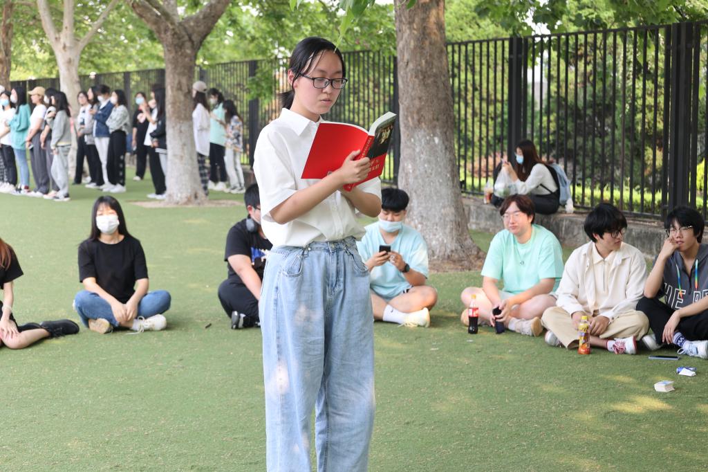 我院2102班的汪琰同学领读到“同学们到基层去,到边远地区去,到社区去,到农村去,到军营去!……”时,她停下来,神色动容地与同学们分享自己参加返家乡社会实践活动,做驻村大学生时为村民排忧解难的经历,鼓励同学们积极参与社会实践活动,以此来长才干、强本领。她强调:我们青年学子既要积极开动脑筋,攻坚克难,开拓全新领域,更要沉心静气,有把冷板凳捂热的勇气和能力。同学们被书中的精神感动,纷纷检视自身,表示将以时代责任为己任,为实现第二个奋斗百年目标贡献自己的青春力量。