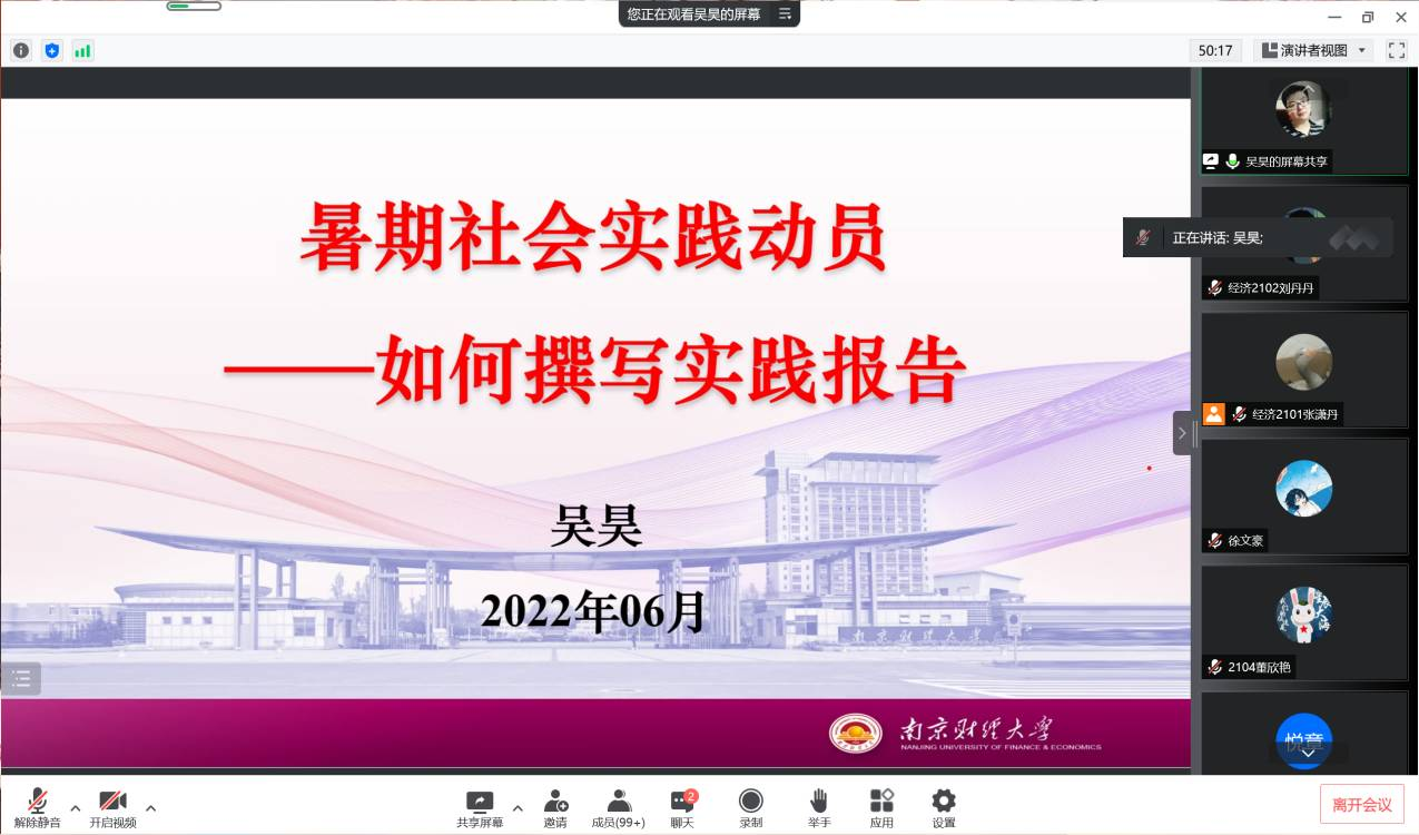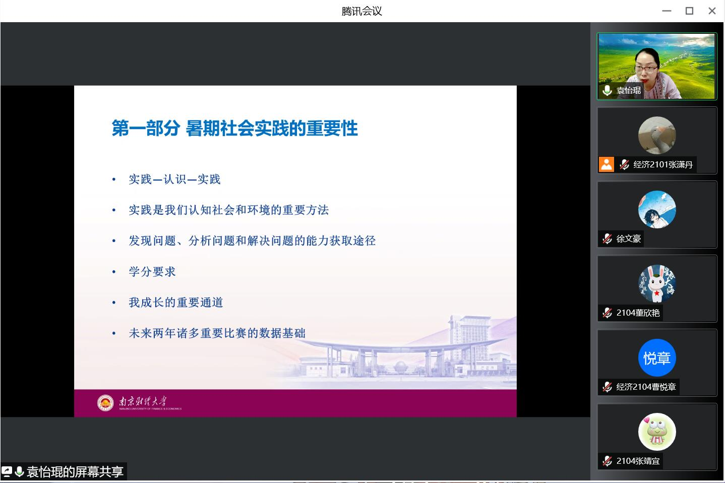 紧接着,潘怡老师进行动员,她详细解读了有关通知,对于社会实践活动方向、组织形式、时间节点和活动阶段安排等具体事项作了要求。最后,校团委副书记(挂职)、我院辅导员梁少颖老师对暑期社会实践注意事项进行了强调,提醒同学们注意疫情防控及自身安全,鼓励同学参与团队实践参加并积极投稿。最后的自由提问环节,同学们踊跃提问,两位老师进行了耐心、细致的解答。