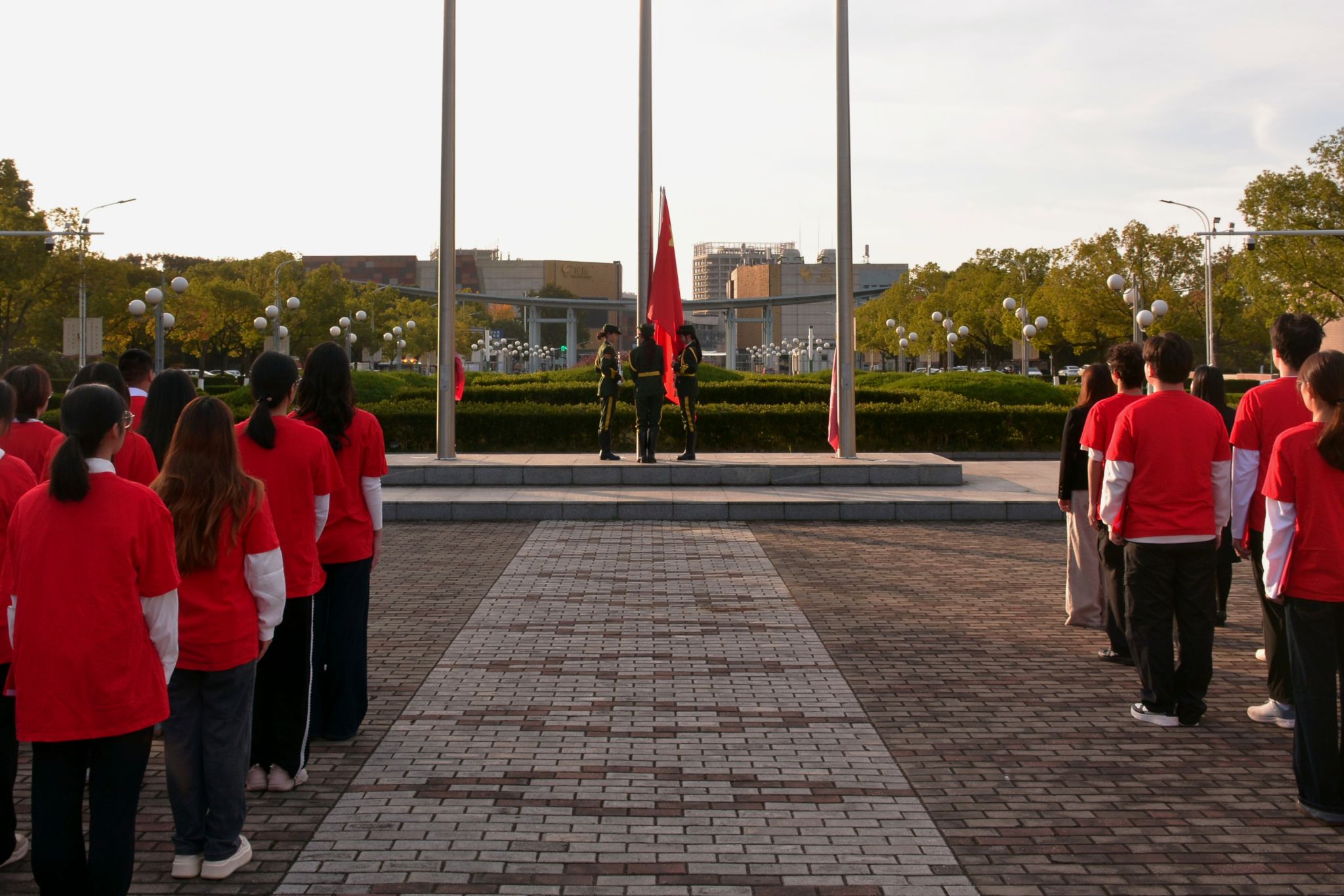 上午7时30分,升国旗仪式正式开始。国旗班队员们精神抖擞、步伐铿锵,护卫着五星红旗庄严走向升旗台。在激昂的《义勇军进行曲》中,鲜艳的国旗冉冉升起,迎风飘扬。全体师生肃立行注目礼,齐唱国歌,深情表达对祖国的热爱与崇敬。