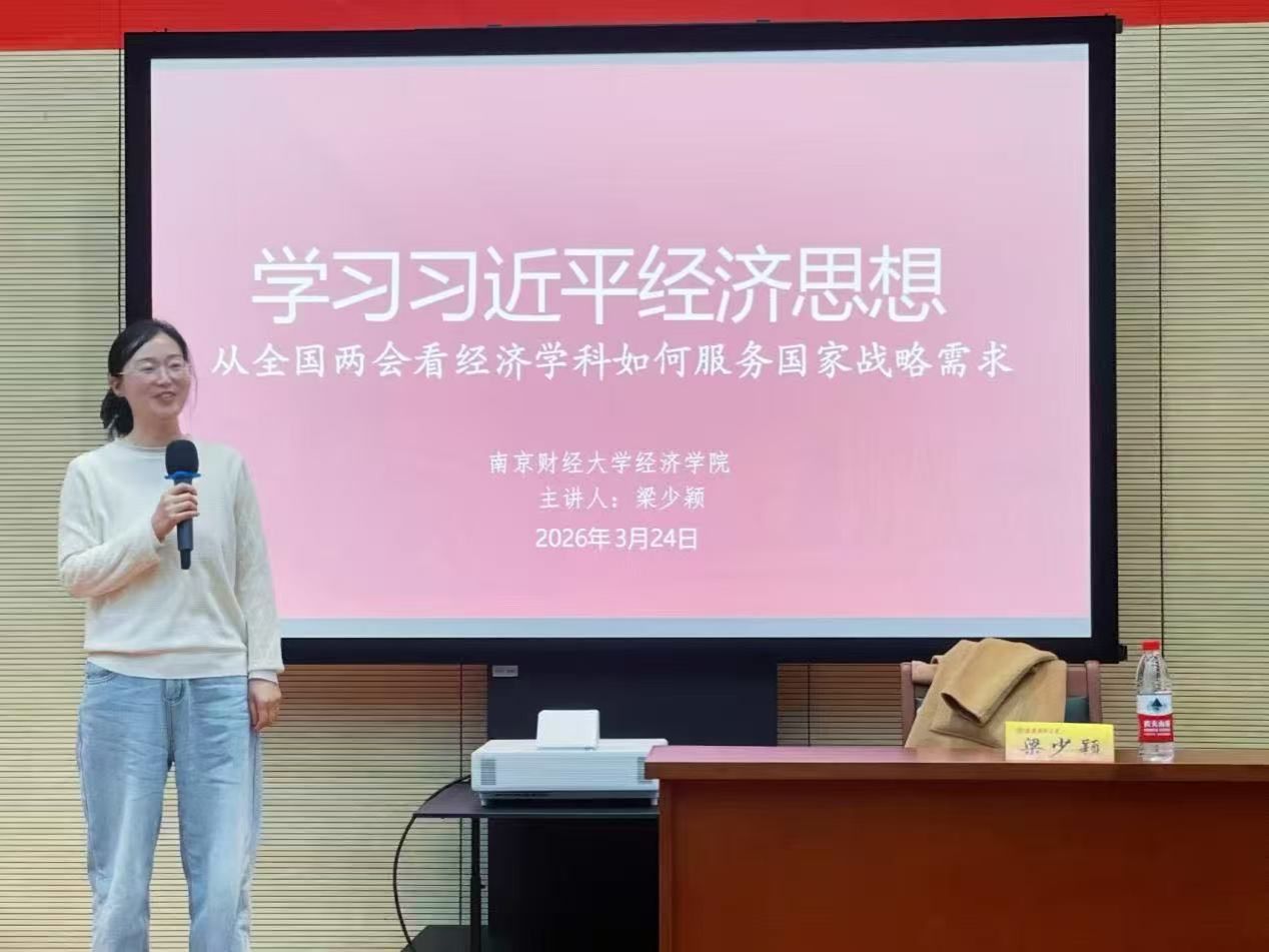 为扎实开展习近平经济思想学习,3月24日晚,william威廉中文于图书馆世界之窗举办了学习贯彻2026年全国两会精神专题讲座。“红色领航”辅导员工作室成员梁少颖老师为本科生讲授了题为“学习习近平经济思想——从全国两会看经济学科如何服务国家战略需求”的专题思政课。
