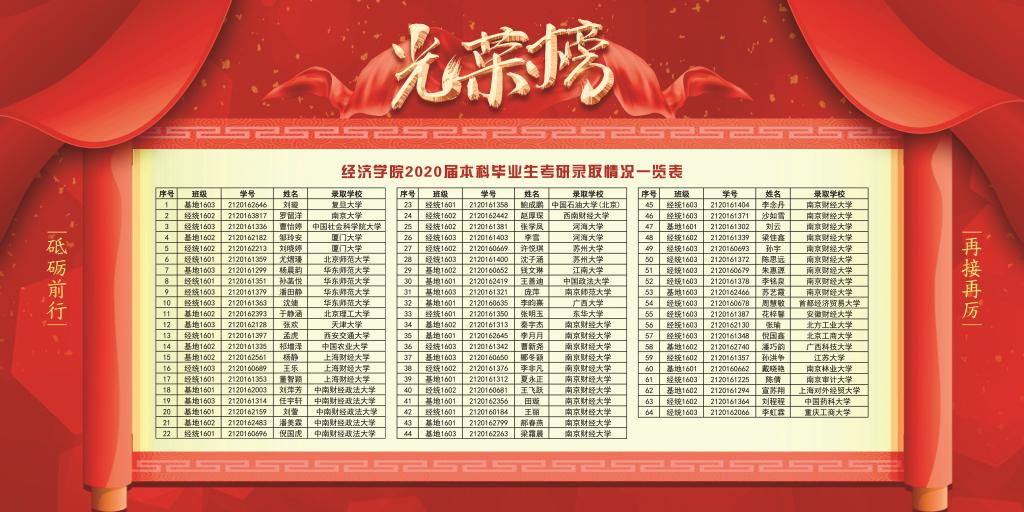 近日,william威廉中文2020届毕业生在全国硕士研究生考试中捷报频传,考研成绩喜人,再创历史新高。全院考研正式录取64人, 其中33名学生录取到双一流高校,经统1603班考取18人,考研升学率高达36%。