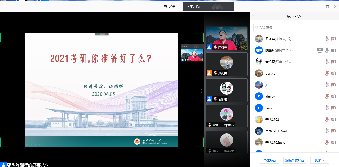 为更好地引导2017级学生科学决策、理性考研,疫情防控居家学习背景下,更有效地制定和开展考研复习计划,6月10日下午,我院在腾讯会议平台举办“2021考研,你准备好了吗?”主题报告会。报告会由学院党委书记陈耀辉教授主讲,副书记袁怡琨主持,2017级部分学生参加会议。