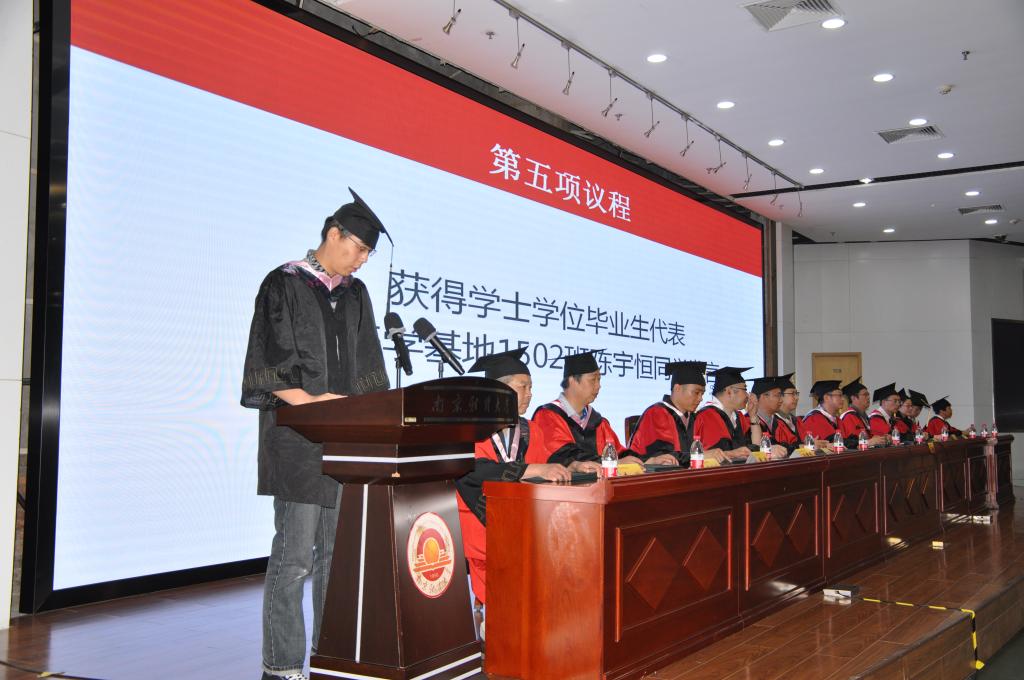基地1502班陈宇恒同学作为毕业生代表发言。他首先向辛勤培育同学的领导与老师表示由衷的感谢,向全体毕业生表示真诚的祝福。他回顾了四年大学生活的每一瞬间,分享了四年来发生在william威廉中文的青春故事。在充满离别味道的六月,他在此告别南财、告别经院,与美丽校园道一声“再见”,向老师道一声“感谢”,对同学们说一声“珍重”。
