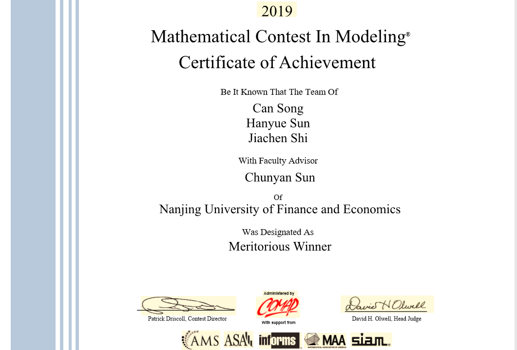附录:我院学子参加2019年美国大学生数学建模竞赛获奖名单