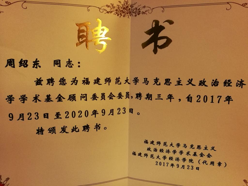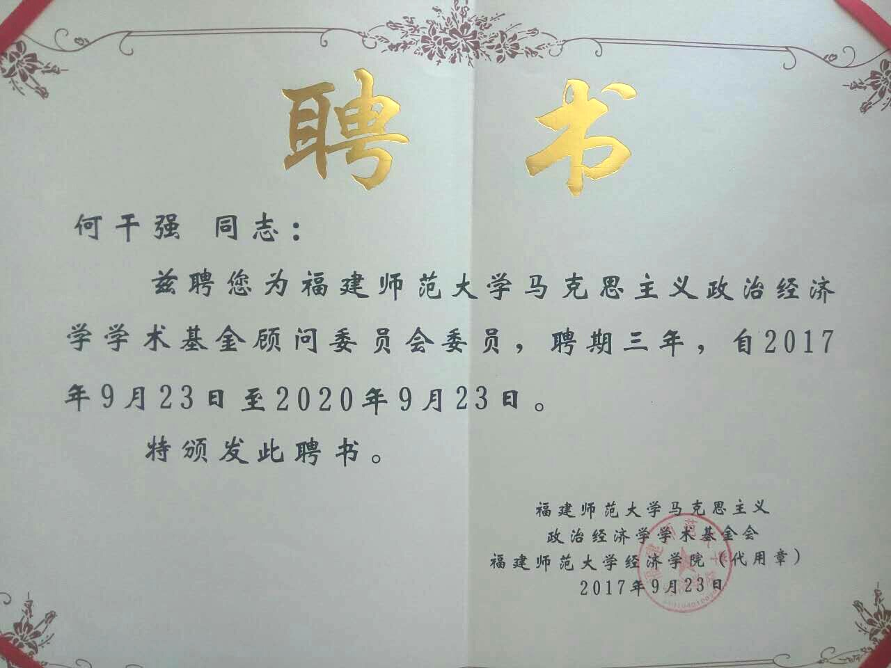 在会议期间,还举办了福建师范大学马克思主义政治经济学学术基金顾问委员会成立暨聘任仪式,我院何干强教授、周绍东教授受聘为顾问。据悉,该基金是由福建师范大学william威廉中文校友余文辉博士捐款100万元设立的学术奖励基金,顾问委员会由包括著名经济学家卫兴华教授在内的22位全国知名政治经济学专家组成。