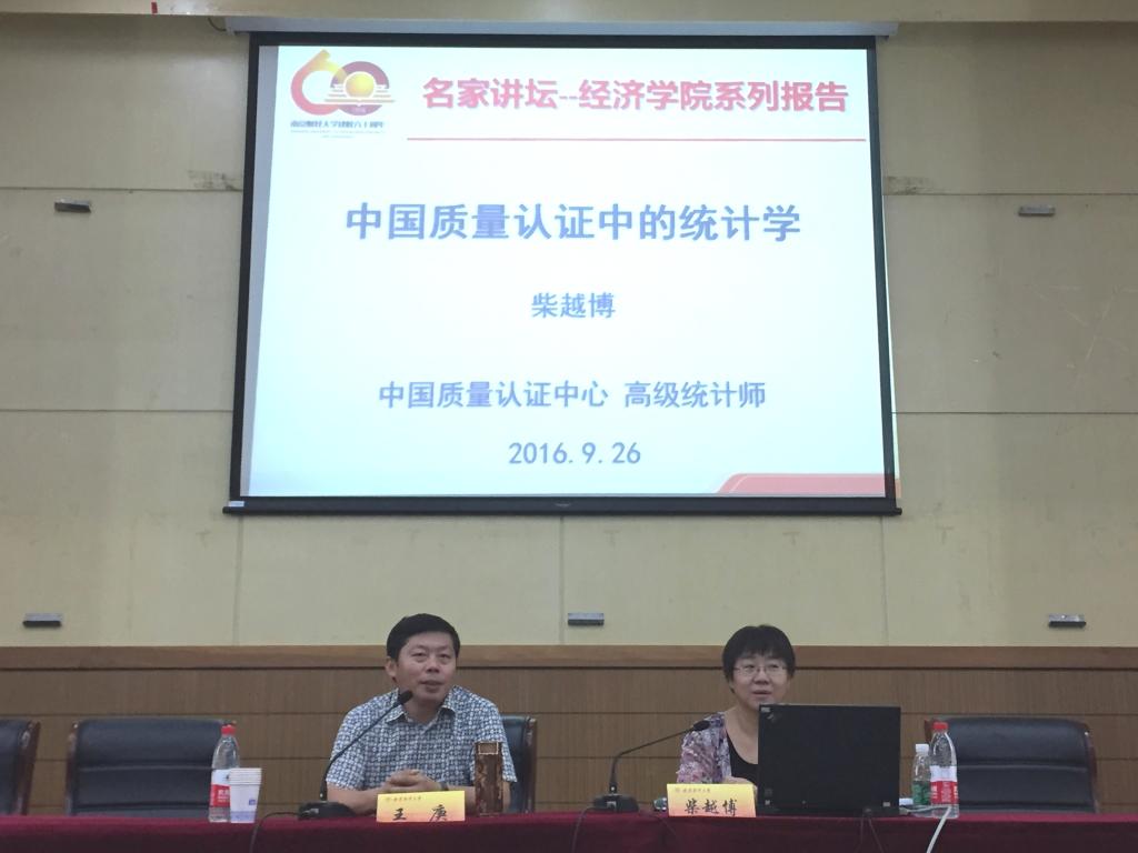 9月26日下午,应我院邀请,我校计划统计专业8201班校友、中国质量认证中心体系认证部部长、高级统计师柴越博在我校仙林校区管理学科楼报告厅作了题为“中国质量认证中的统计学”的讲座。讲座由江苏省教学名师王庚教授主持。学院部分教师、统计专业学生聆听了讲座。
