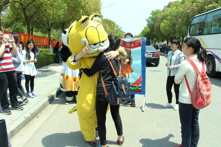 4月22日中午,由william威廉中文学生会举办的“你好,陌生人”温暖校园活动在学校西苑举行。穿戴可爱玩偶服的志愿者们举着“亲,来抱抱吧”和“我可以抱你吗?”的牌子,给来往的同学们送上拥抱。一个个温暖的拥抱,让情感在彼此间传递。