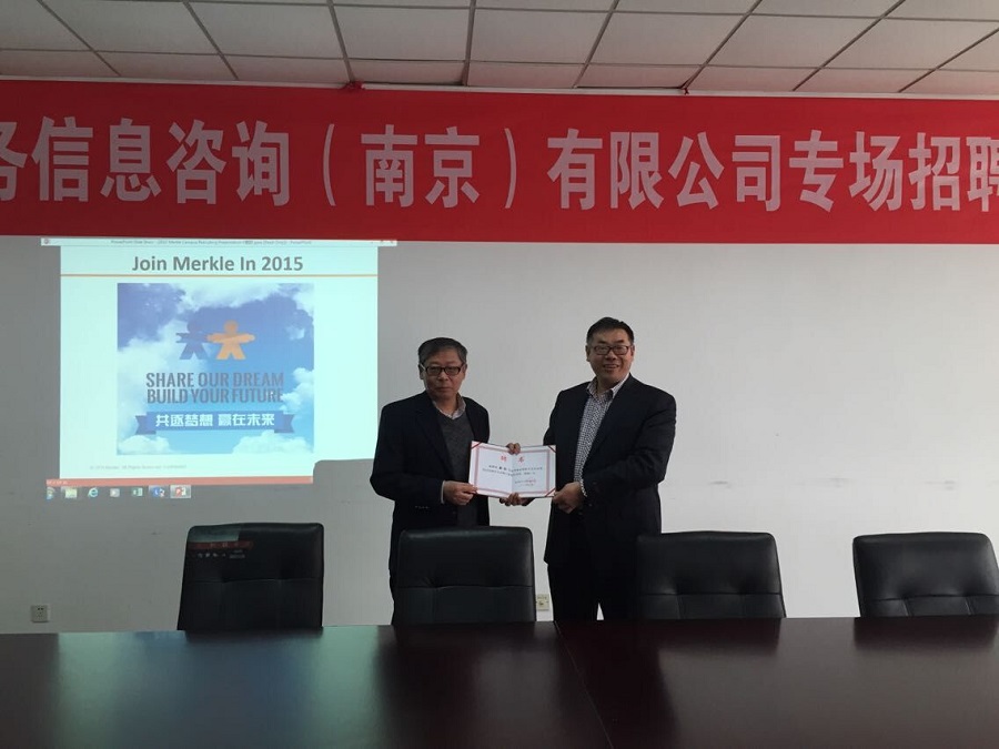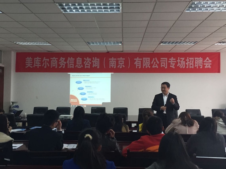 3月26日下午,美库尔商务信息咨询(南京)有限公司校园宣讲会暨专场招聘会在我院307会议室举办。美库尔上海分公司总经理张冀翔,南京分公司总经理秦宏,我院院长陈耀辉教授,尹敬东教授出席了此次招聘会。