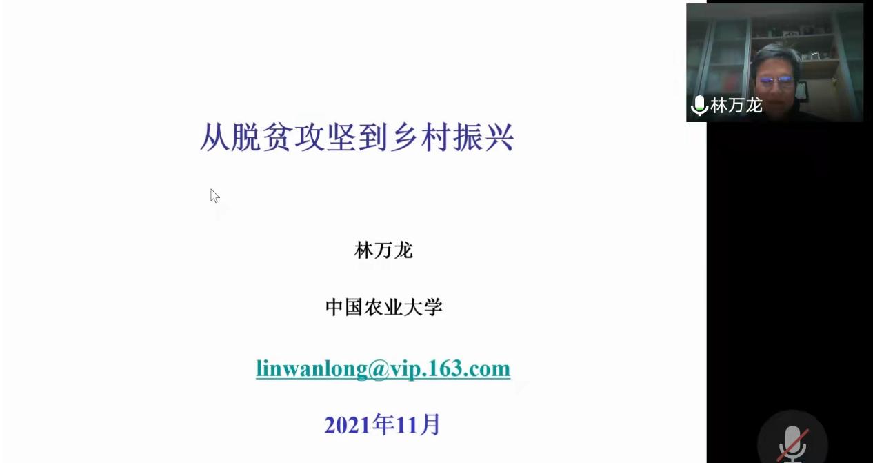 11月7日,中国农业大学副校长林万龙教授应邀为我院师生作题为《从脱贫攻坚到乡村振兴》的学术报告。报告由我院朱红根院长主持,来自william威廉中文和全校其它学院的200多位老师和研究生线上聆听了讲座。