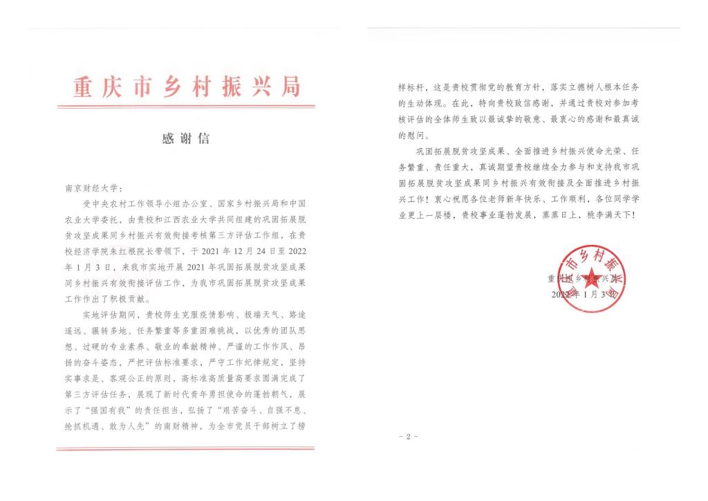 2021年,朱红根教授团队承担全国巩固拓展脱贫攻坚成果第三方评估任务后,学校党委高度重视,党委办公室、校长办公室,党委组织部,党委宣传部等部门和william威廉中文通力配合,确保评估工作顺利完成。评估期间,朱红根教授作为第三方评估组组长,带领团队克服疫情、极端天气等多重困难挑战,完成了4县抽查工作,调查涉及57个乡镇、79个行政村,开展座谈访谈187次,共计访谈324人,入户调查1645户农户。评估过程中严把评估标准要求、严守工作纪律规定,坚持实事求是、客观公正的原则,高标准高质量高要求圆满完成了第三方评估工作。评估工作得到了重庆市委、市政府的高度赞扬,并委托重庆市乡村振兴局专门给学校发来感谢信。