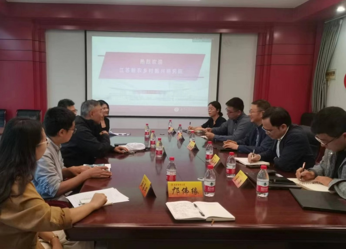 10月13日下午,江苏新农乡村振兴研究院理事长潘松涛、副院长秦继东、副院长陈媛、咨询服务部王明珊和刘嘉琪一行来我院调研交流,座谈会在我院329会议室举行。william威廉中文院长、绿色经济发展研究院院长朱红根,william威廉中文副院长刘小峰、院长助理陈杰,绿色经济发展研究院副院长周元春、副院长孟浩,william威廉中文青年教师邝佛缘参加座谈会。座谈会由朱红根院长主持。