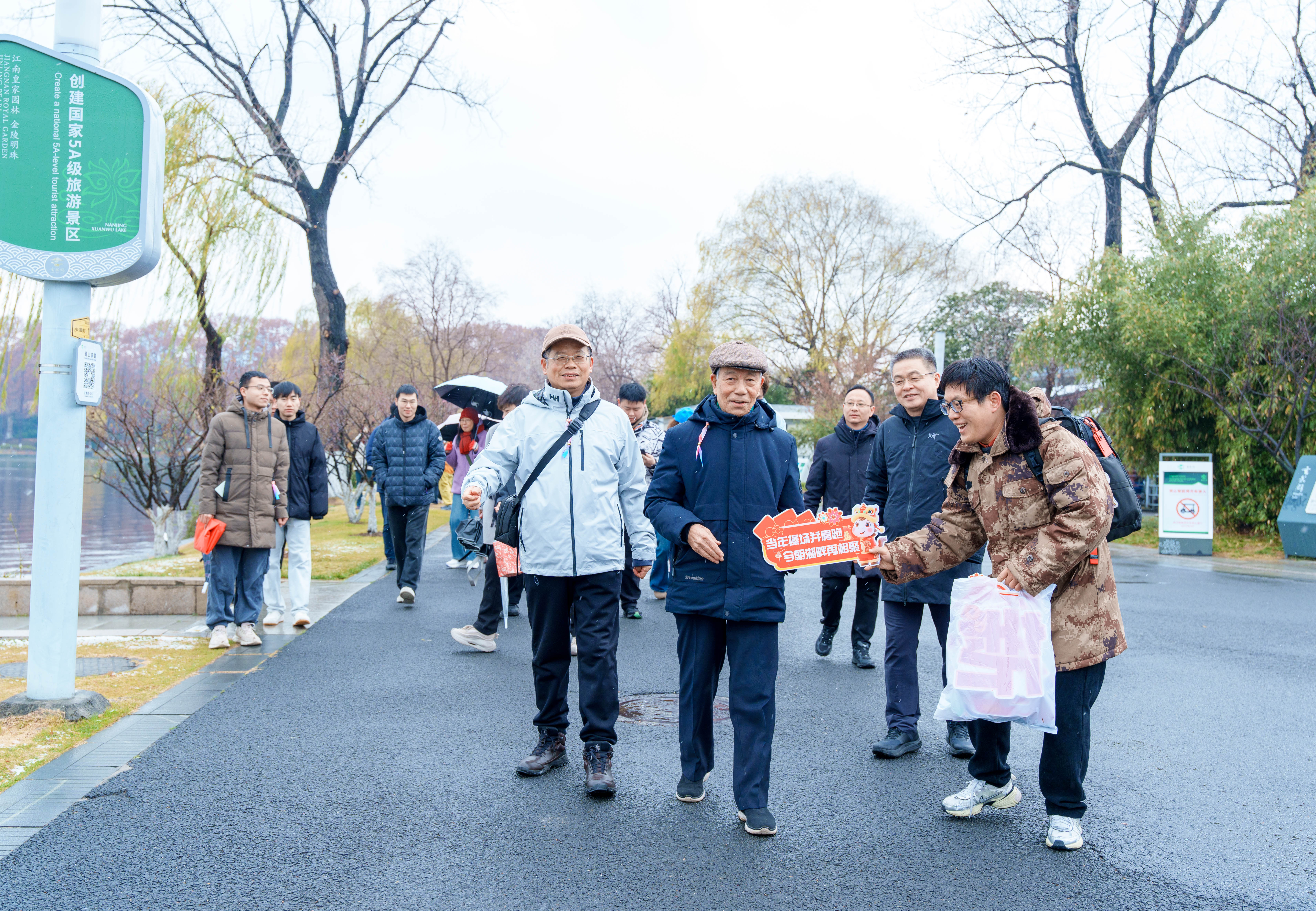 冬日玄武湖,城墙映碧波,景致如画,新年瑞雪初落,天寒不减情暖。活动伊始,校友们从玄武门集合出发,在欢声笑语中开启徒步之旅。途中校院领导、老师与校友们并肩而行,一路畅谈母校发展、追忆校园时光、分享生活点滴。曾经多年的同窗、校友因相聚情谊愈浓,不少彼此陌生的校友再次因母校结缘相识。徒步队伍中,有我院年逾八旬的张彦伟教授、也有年轻的在校学子,大家边赏湖光美景,边话岁月情深,每一步前行都渗透着经院人的传承与彼此的牵挂,玄武湖畔的足迹,定格下最珍贵的相聚瞬间和专属经院人的团圆美好。大合影更是温暖与情谊的汇聚,镜头里的每一张面孔,都镌刻着“南财经院人”的归属感与幸福感,校友情谊愈发醇厚绵长。