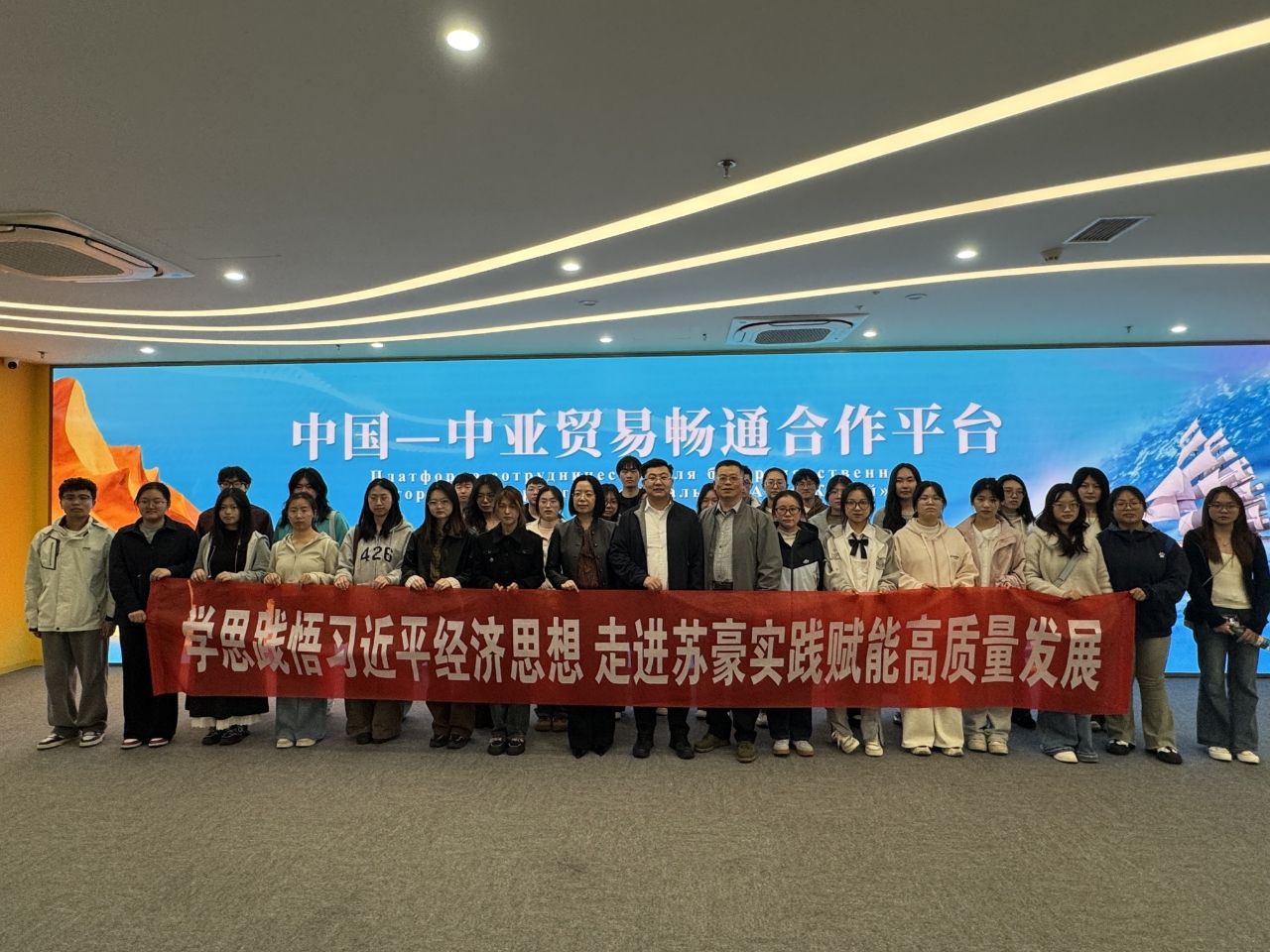 张圣兵书记一行首先参观了江苏中亚中心。在徐行副总经理等的陪同下,师生们细致了解了该中心的创建背景、功能布局、运营模式及服务内容。作为国家级经贸合作平台,江苏中亚中心集贸易合作、产业协作、产教出海、传播交流等功能于一体,重点推动中国与中亚国家间农产品、矿产品、石油天然气进口及光伏组件、纺织服装等日用品的双向贸易,在中亚贸易便利化与企业出海服务中发挥着重要的桥梁纽带作用。大家对江苏中亚中心的建设成果、运营成效有了直观且深入的认识。